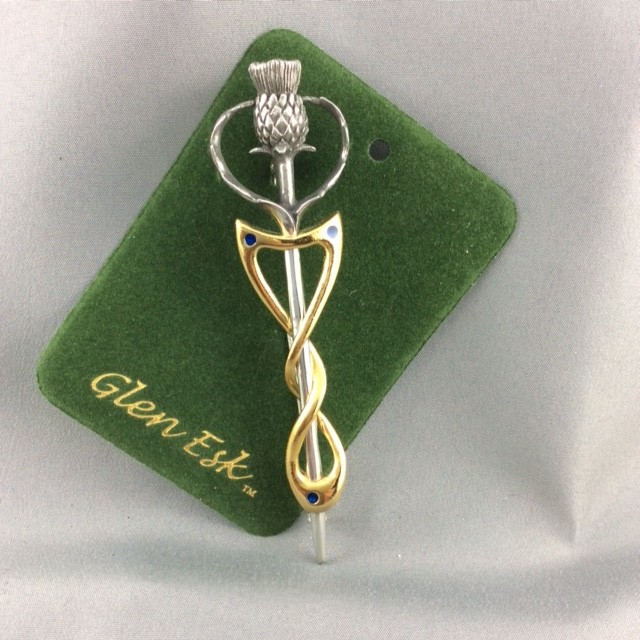 Approximately 4 inches long. Chrome Thistle and Gold Gilt celtic knot design. Perfect for the kilt,plaid or jacket.