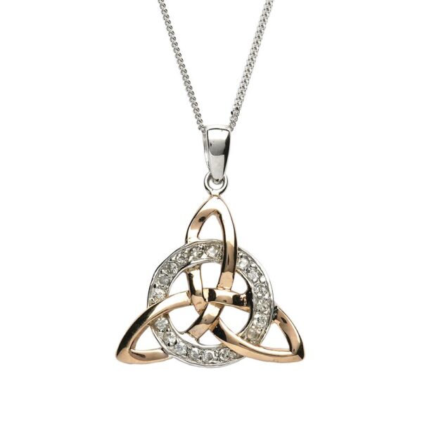 This pretty sterling silver pendant brings heritage to the 21st. century. The rose gold plated Trinity Knot gently hangs intertwined with a circle of shimmering cz stones.